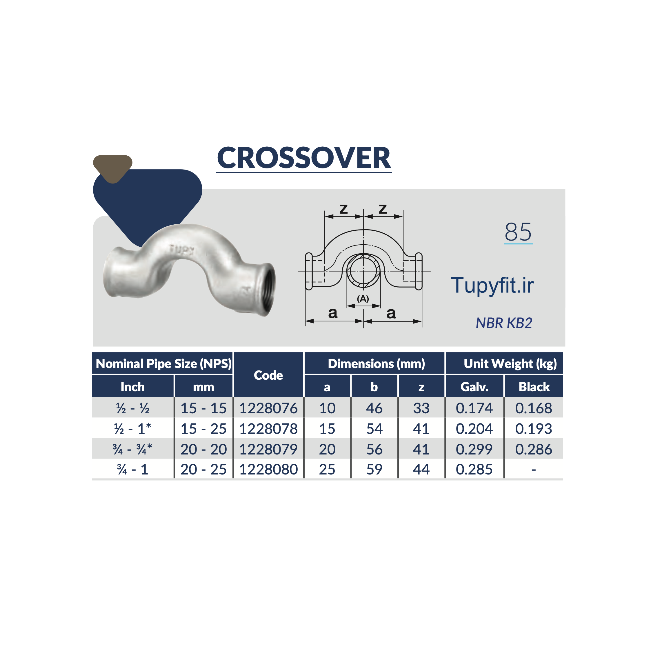 بر اساس استانداردهای ABNT NBR 6943، ISO 49 و EN 10242 برای انتقال سیالاتی مانند آب، بخار، سوخت، روغن هیدرولیک، هوای فشرده و گازها طراحی شده است. پل توپی برزیل در سایز ″۳/۴ و از چدن چکشخوار سیاه با فرمول اختصاصی Tupy مطابق استاندارد ABNT NBR 6950 تولید میشود.