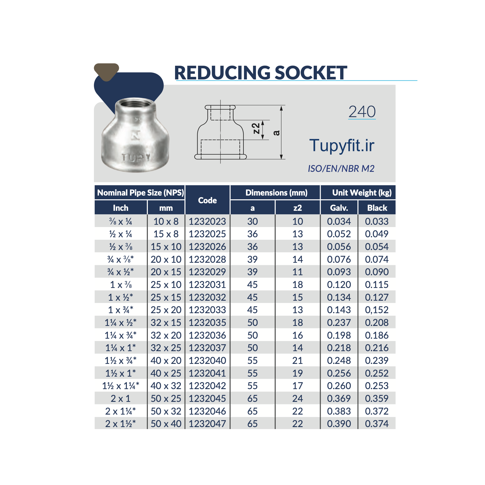 بر اساس استانداردهای ABNT NBR 6943، ISO 49 و EN 10242 برای انتقال سیالاتی مانند آب، بخار، سوخت، روغن هیدرولیک، هوای فشرده و گازها طراحی شده است. بوشن تبدیلی توپی برزیل در ابعاد مختلف و از چدن چکشخوار سیاه با فرمول اختصاصی Tupy مطابق استاندارد ABNT NBR 6950 تولید میشود.